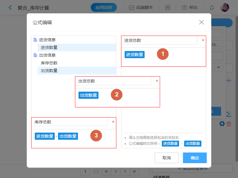 “库存总数”大于等于0,表示“出货信息”所登记的“出货数量”不可超过“库存总数”,否则拦截本次表单操作,并提示校验所配置提示文字。