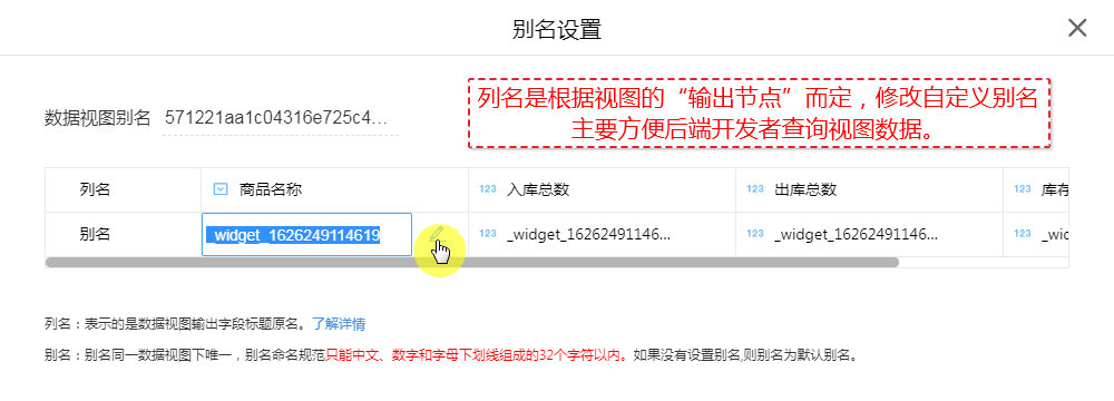 • 可修改自定义别名,别名主要作用是方便后端开发者根据别名查询视图数据。