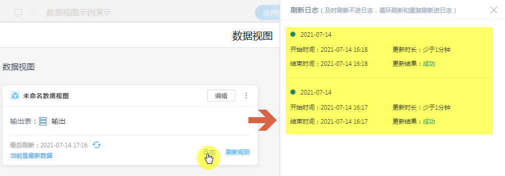 • 展示数据视图的刷新日志,日志显示为30条。