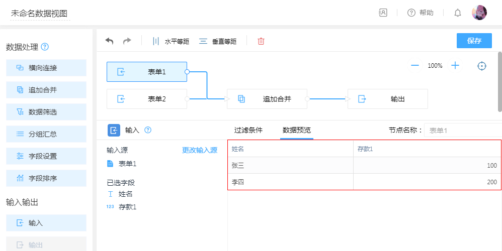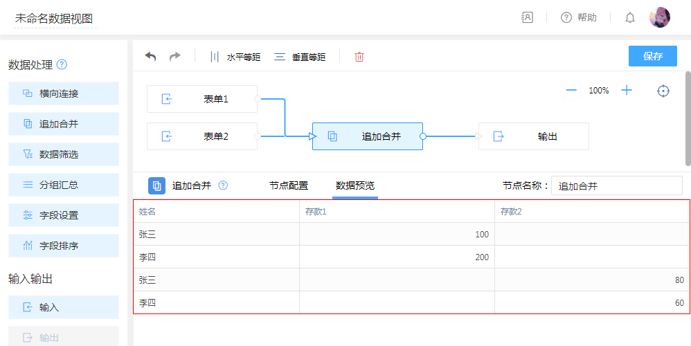 在“节点配置”手动调整不同名的字段为一列,即可查看当前效果。