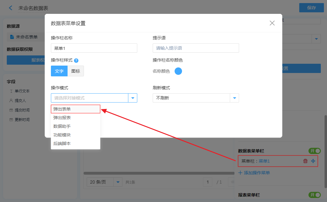 配置“报表数据表菜单”模式为“弹出表单”,在弹出表单页面时触发