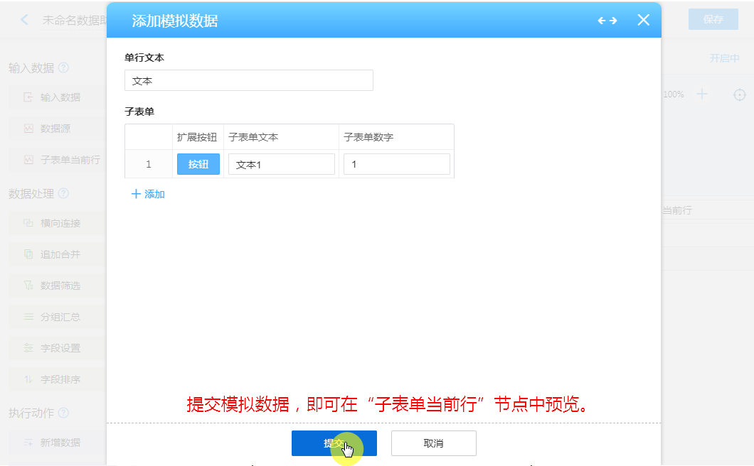 添加模拟数据方便配置其他节点功能,进行数据效果预览。