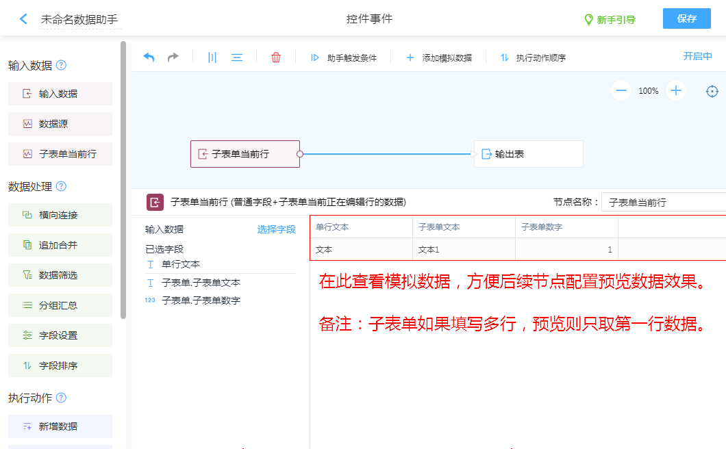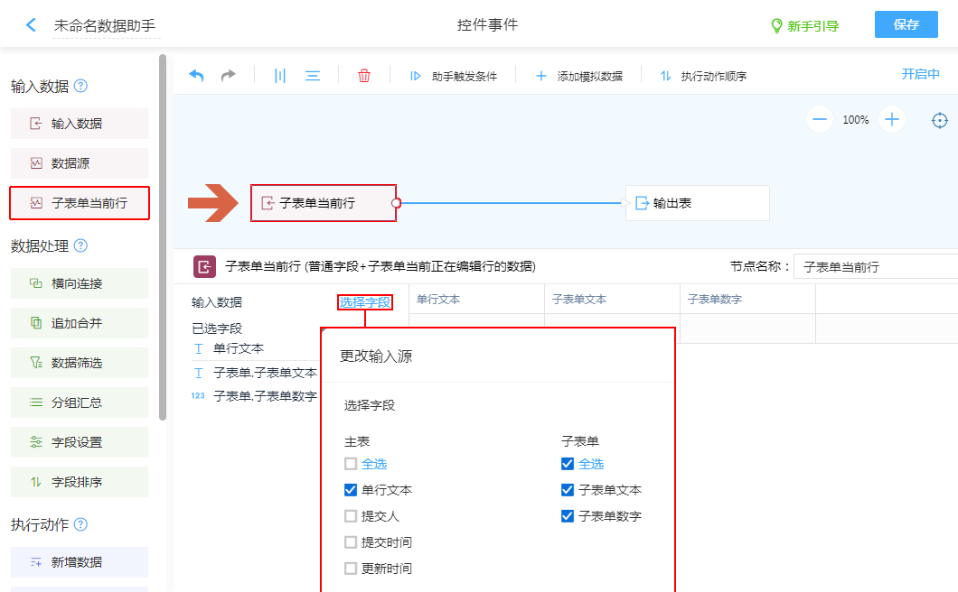 专属子表单内配置,传入子表单触发所在当前行数据到数据助手处理。