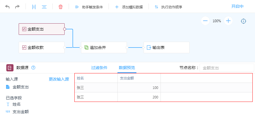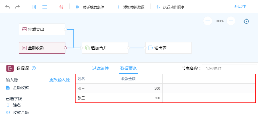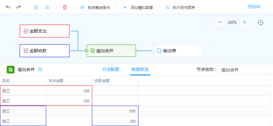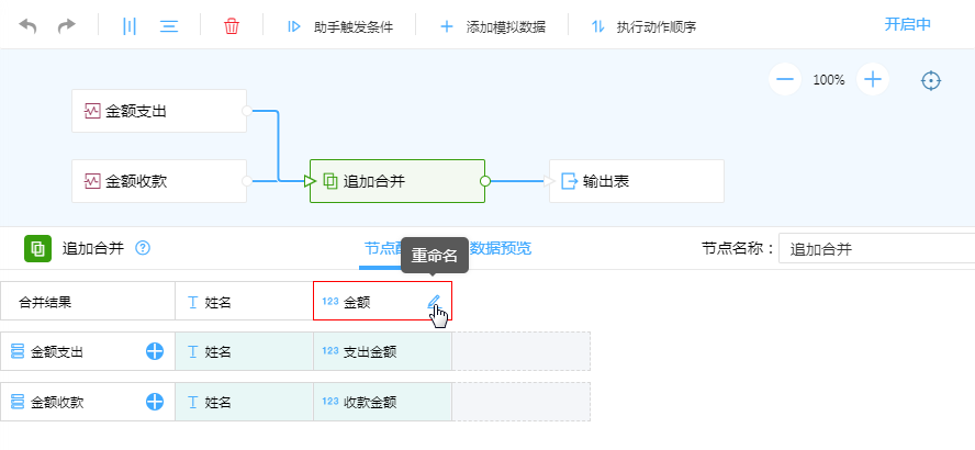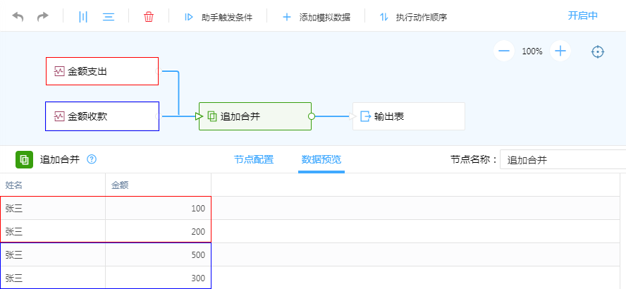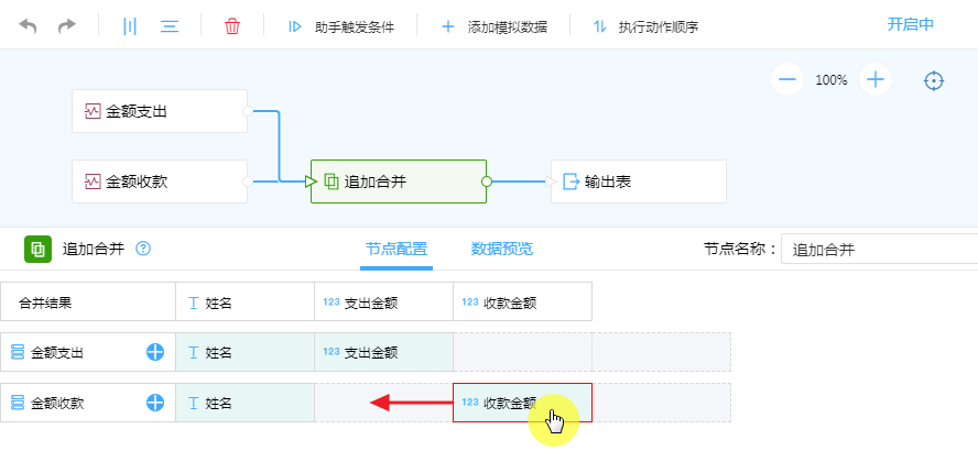 在“节点配置”手动调整不同名的字段为一列,即可查看当前效果。